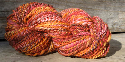 8 ounces of superwash merino roving from Matahari Spinnery. Most of the shades are warm, but I wanted to introduce a little surprisey contrast of green. It ended up too pale and blue and I just didn't like it. These dyes are pretty old and not always predictable.